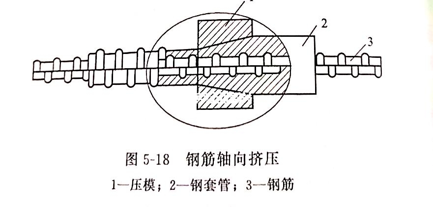 钢筋轴向挤压连接是采用挤压机与压膜对钢套筒及插入两根对接钢筋,朝其轴方向进行挤压,使套筒咬合到带肋钢筋的肋间,并使其结合成一体,如图所示。