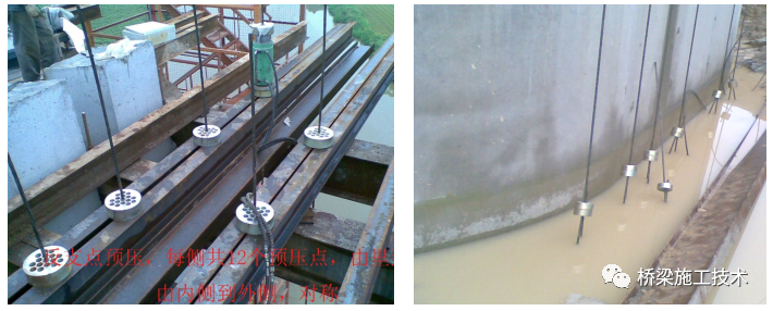 托架预压利用主墩 承台预埋件结合 千斤顶张拉设备对 预应力钢绞线 施加集中荷载进行。千斤顶安放在托架沿桥横向外侧牛腿支架上,并通过张拉锚固于承台上的钢绞线对托架进行等效加载,完成预压。预压荷载取箱梁施工荷载的110%。按荷载均匀相等的原则,每侧悬臂两外边牛腿支架处对称布置千斤顶,均匀加荷达满载后,持荷24h,量测各节点处高程,千斤顶回油卸载,再次量测各节点处高程,两次高程之差值,即托架的弹性变形。 全部卸完后对现浇支架全面进行测量并作好记录。