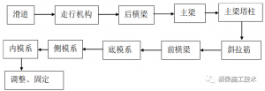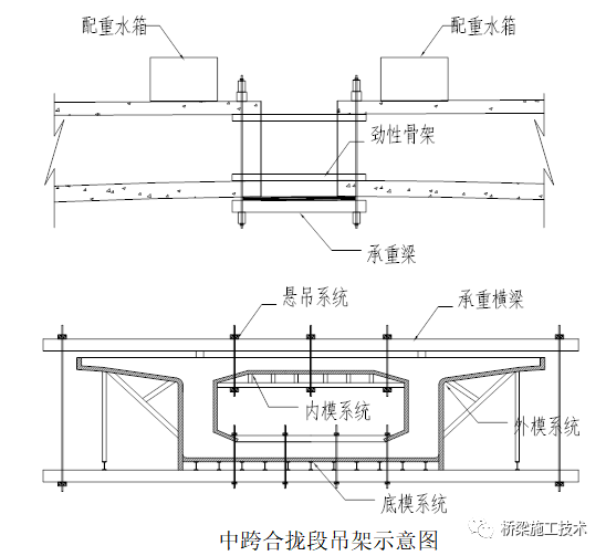 连续梁箱梁施工内容包括: 0#梁段托架加工及安装、静载试验、0#梁段施工、挂篮安装及静载试验、悬臂节段浇筑、直线段施工 、边跨合拢、中跨合拢。 边跨、中跨合拢段均采用挂篮吊架施工。合拢顺 序由先边跨后中跨对称进行 ,即先边跨合拢,后中跨合拢。边跨合拢前,安装边跨合拢吊架、安装合拢段模板、绑扎钢筋、预应力管道定位,在15℃左右焊接劲性骨架,张拉2根CB1、2根CT1至50T,在T构两悬臂端部预压合拢段1/2混凝土重量,预压采用砂袋或水箱灌水,浇筑合拢段C50混凝土时相应逐次抛掉砂袋或水箱放水。待梁段混凝土强度及弹性模量达到设计值的90%且混凝土龄期不小于7天后,张拉合拢段纵向、横向预应力束及竖向预应力筋。待边跨合拢完成后,解除0#节段临时锚固约束及墩旁托架,永久支座受力,安装中跨合拢吊架、模板、绑扎钢筋、预应力管道定位、浇筑合拢段混凝土。待梁段混凝土强度及弹性模量达到要求后,依次对称张拉跨中纵向合拢及中跨合拢段的横向、竖向预应力筋实现连续梁体系转换。