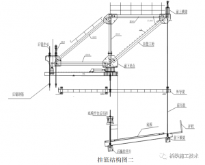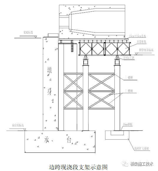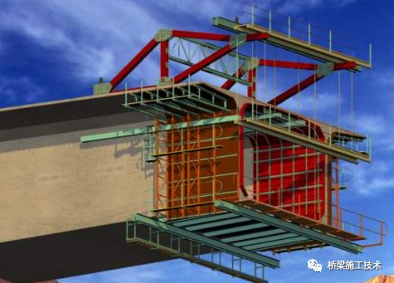 预应力悬臂托架:利用墩身施工时预埋的螺栓,外侧连接悬臂钢托架,内侧连接附壁钢牛腿,托架及牛腿上安设纵、横工字钢,其上为分配梁,分配梁上铺 5cm 厚木板底模,底模上安装镀锌铁皮。考虑由于支架弹性、杆件连接缝隙,模板变形等因素,防止浇筑梁段混凝土时因支架下沉而混凝土出现裂缝,除提高托架的刚度,拧紧各节点螺栓,减小支架变形外,还要对支架进行预压并调整立模标高。