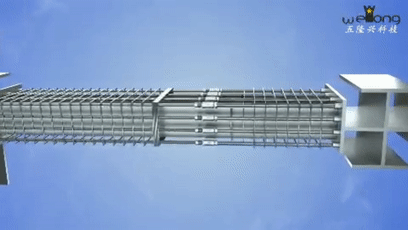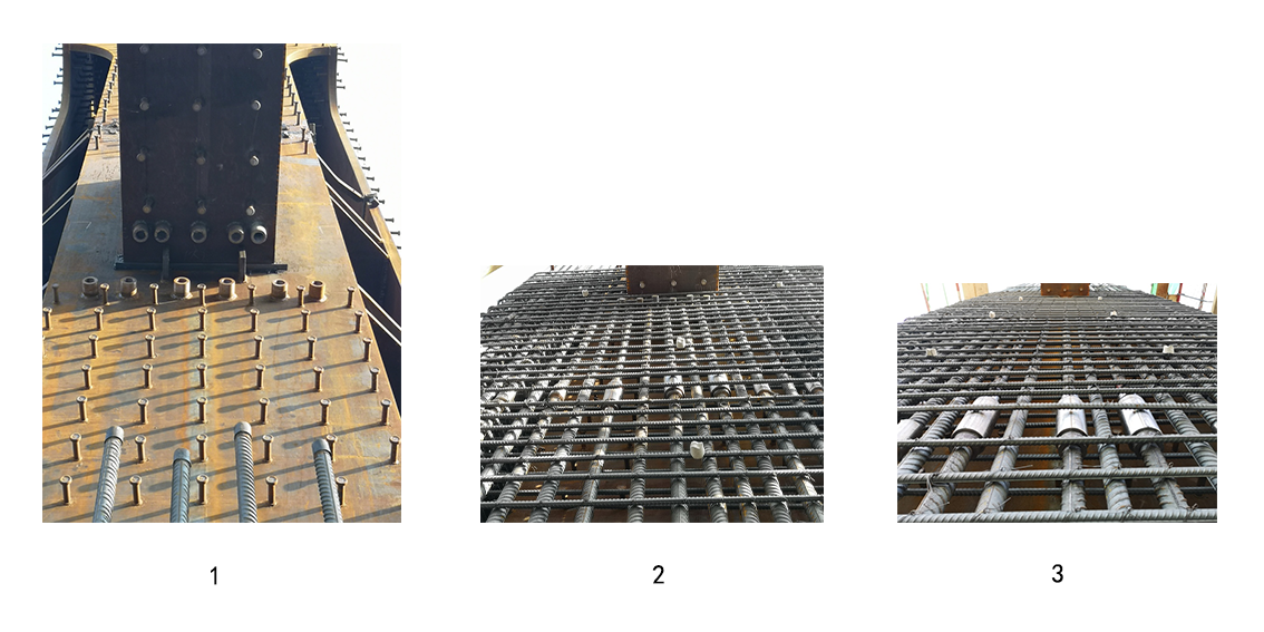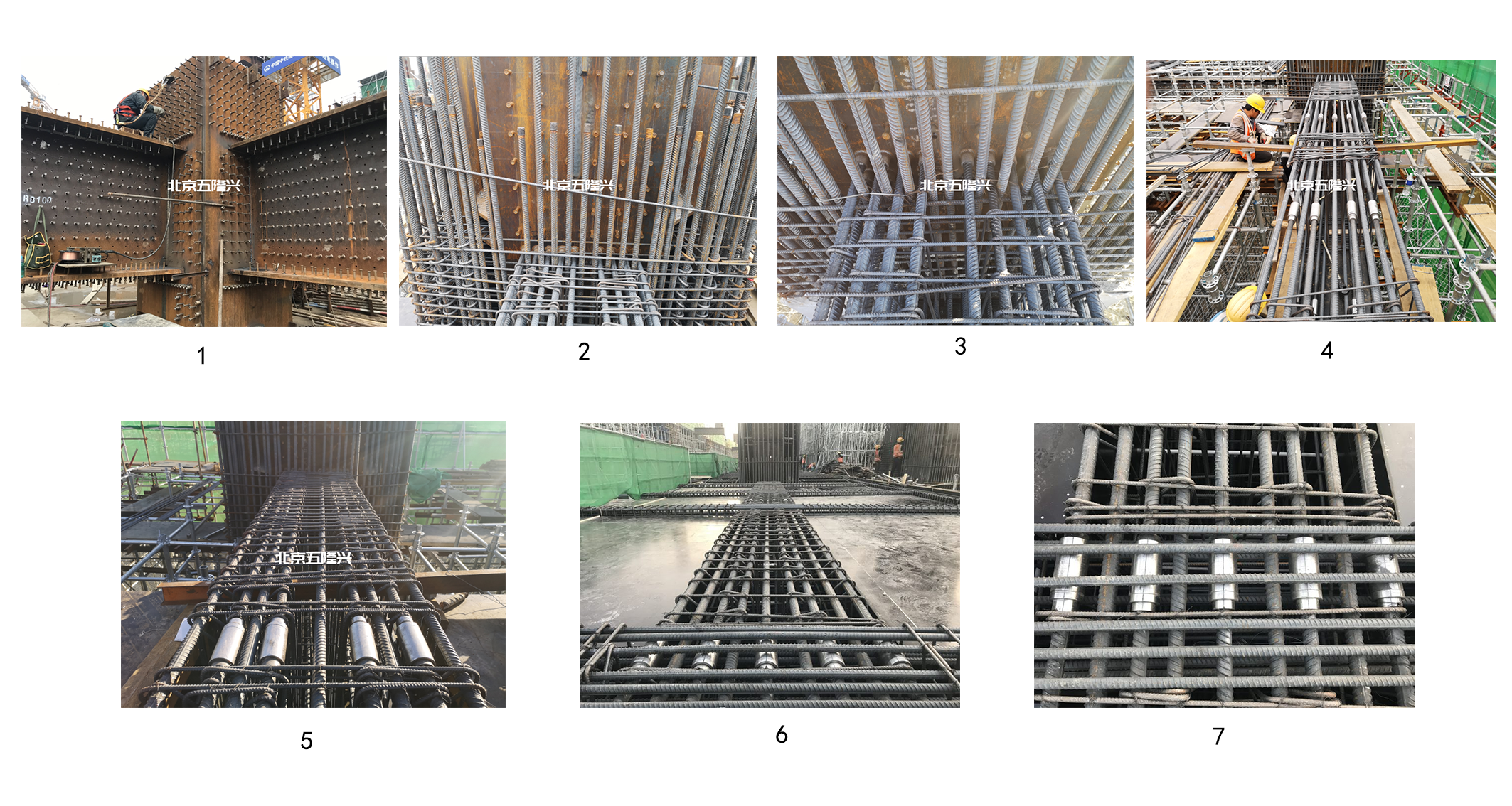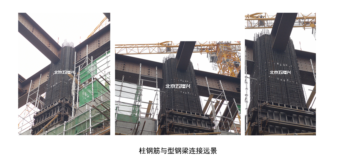 2.柱钢筋与型钢梁上的焊接套筒进行连接,中间位置不能旋转的连接点采用双螺套连接接头,进行原位连接